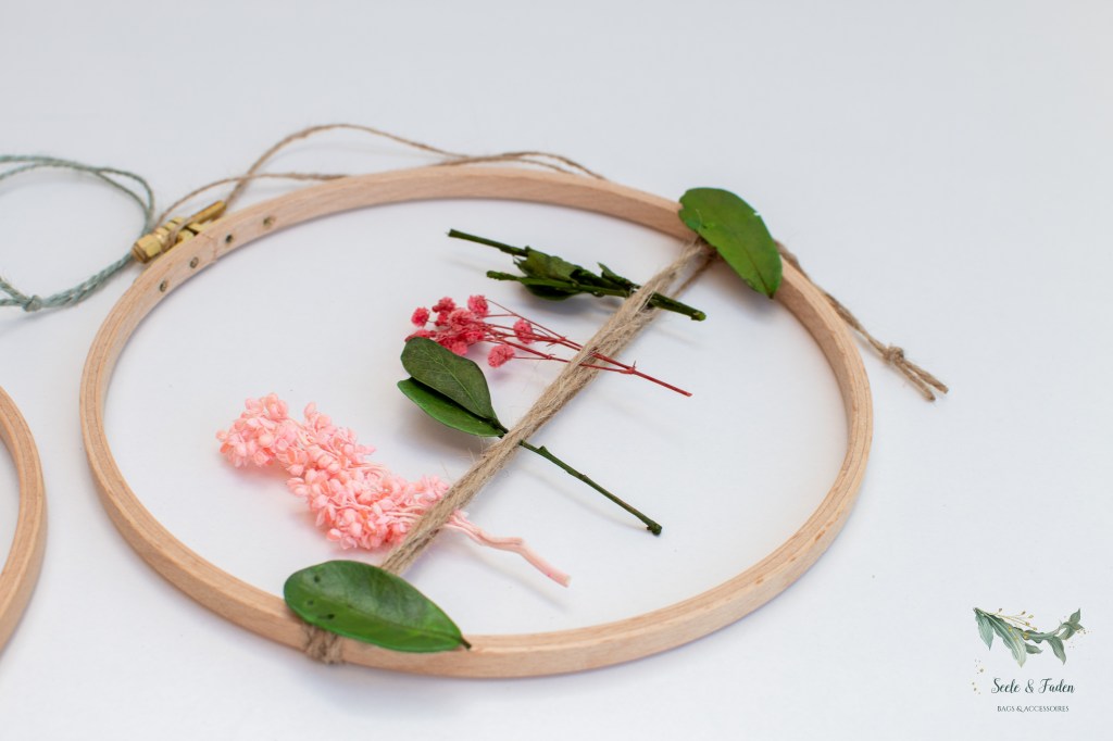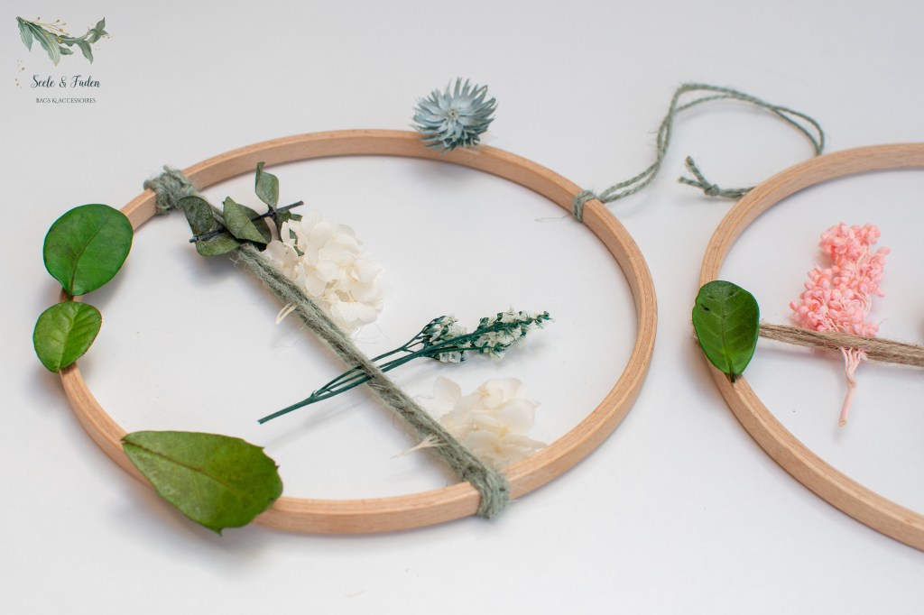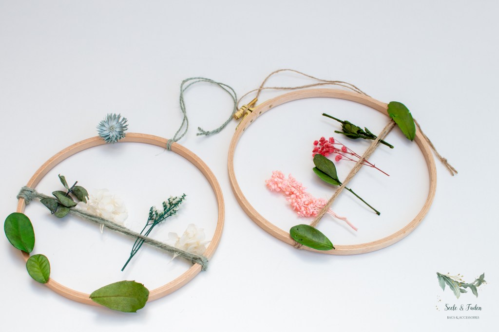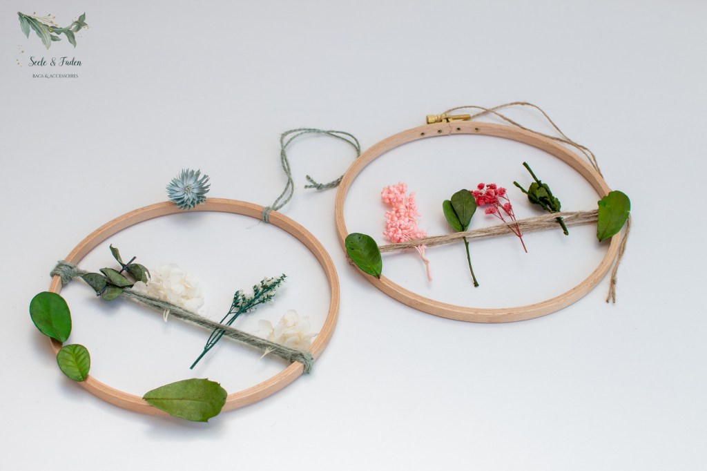 Die kleinen Proben habe ich aber nicht weggeworfen. Mit einem Stickrahmen den ich bei Snaply gekauft habe, sind 2 Blumenkreise als Wanddeko entstanden.